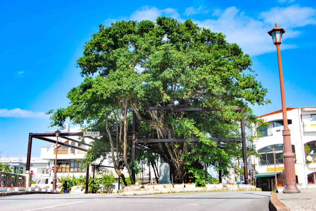 名護十字路START地点には、大きなガジュマルの木が堂々と根を張っています。