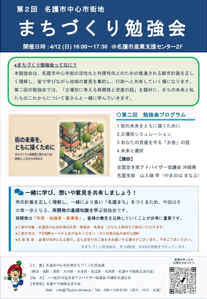 市の計画を正しく理解し、一緒により良い「名護まち」をつくるため、今回はその第一歩となる、再開発の基礎知識を学ぶ勉強会です。私たちと「未来の名護まち」について一緒に考えて、語り合ってみませんか?